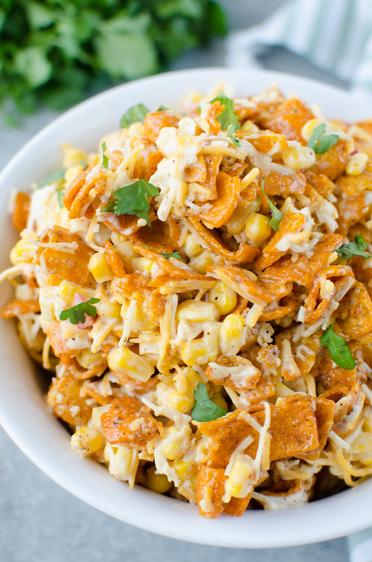 I have never tried Frito corn salad myself, but how amazing does this look? It is made with corn, bell peppers, cheese, chilli cheese Fritos, and is all tossed together in a deliciously creamy dressing.