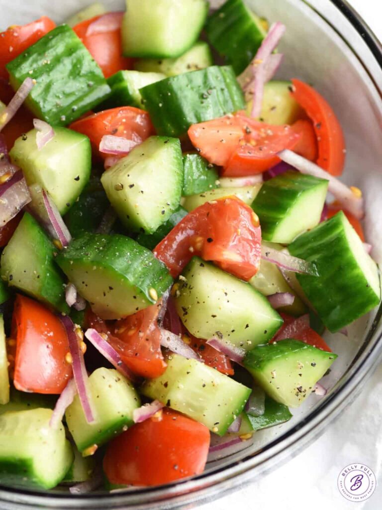 Looking for something light and refreshing? If so, this cucumber and tomato salad is for you. It is the perfect side for a summer BBQ. All you need is 15 minutes of your time and some tasty, simple ingredients you probably already have in your pantry.