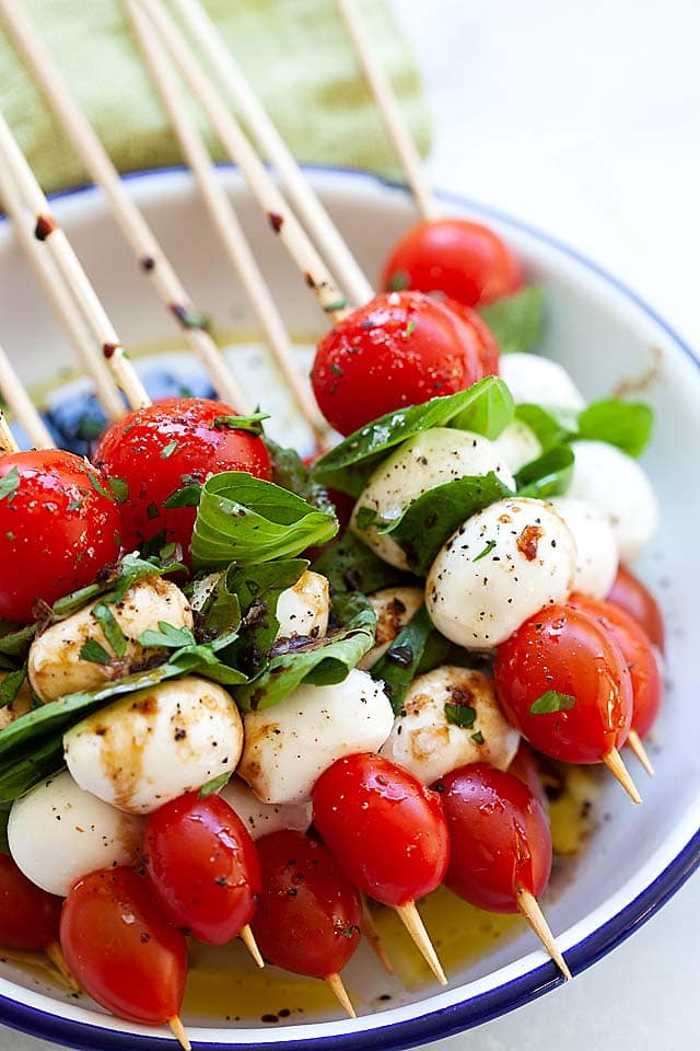 Is there anything more festive than a side that looks like the American flag on the 4th of July? I think not! Recreate this with some fresh blueberries, tomatoes, sliced fresh mozzarella, basil leaves, olive oil, and a few other simple ingredients.