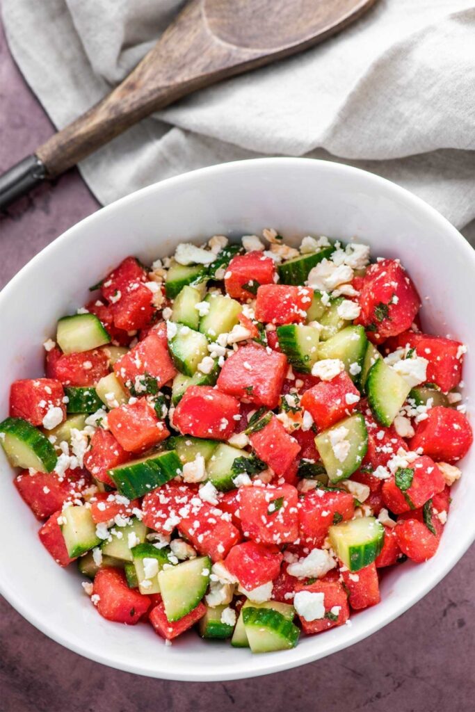 Speaking of light and refreshing, this watermelon salad is exactly that. It is made with lots of tasty watermelon, cucumbers, feta cheese, and is topped with some tasty mint-lime dressing. Watermelons and cucumbers are both high in water content, so it is also great for keeping you hydrated during the summer heat.