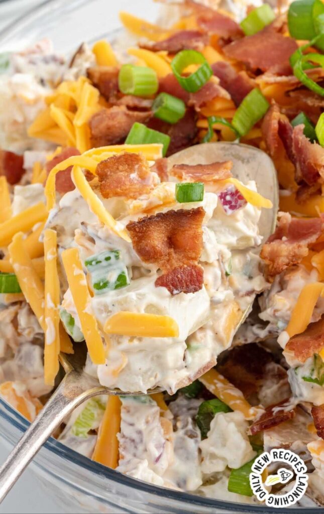 Potato salads are a classic side dish that everyone loves. This recipe is loaded with bacon, onions, and lots of cheese. It is a great side dish idea for the 4th of July. You can eat it by itself or use it as a topping for other foods.