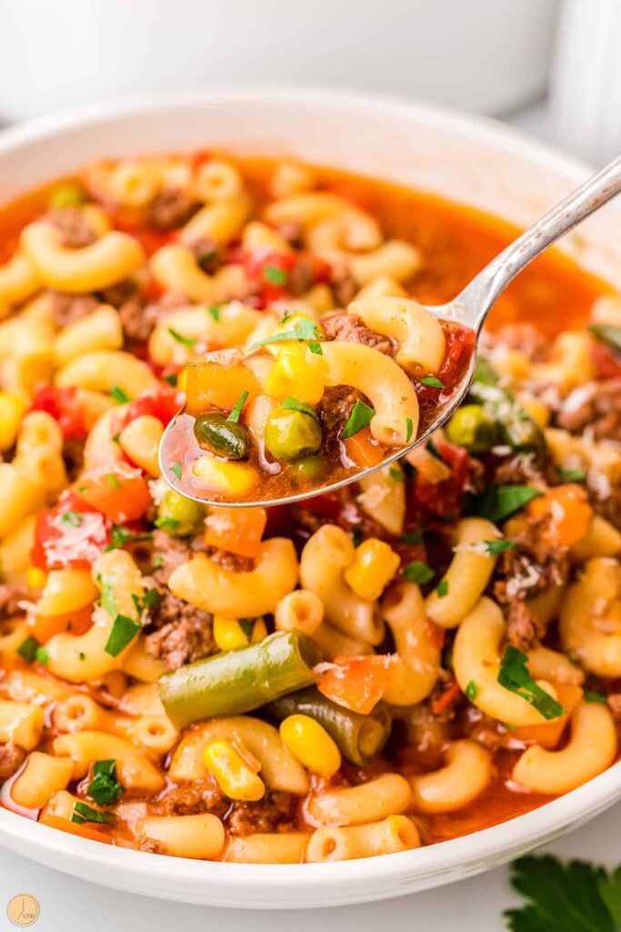 I absolutely love the name of this soup because it IS actually perfect for busy days. It takes you less than 30 minutes to make and is filled with ground beef, healthy veggies, macaroni, and cheese.