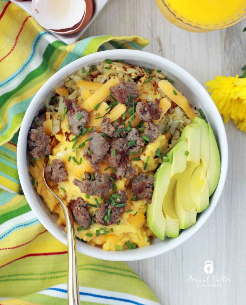 In my opinion, breakfast bowls are one of the best ways to start your morning. It is hearty, nutritious, and so easy to put together. This one includes sausage, hash browns, eggs, and a couple of other ingredients.