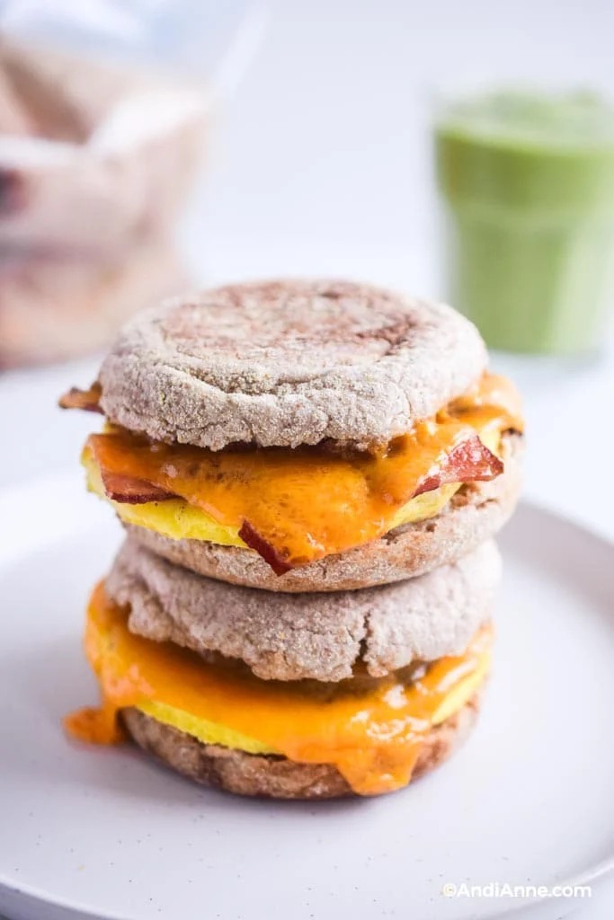 As the name suggests, these breakfast sandwiches are freezer-friendly. Which means you can meal prep these a week in advance. It saves you time and money. You’ll need eggs, milk, bacon, sausage patties, cheese, and English muffins.