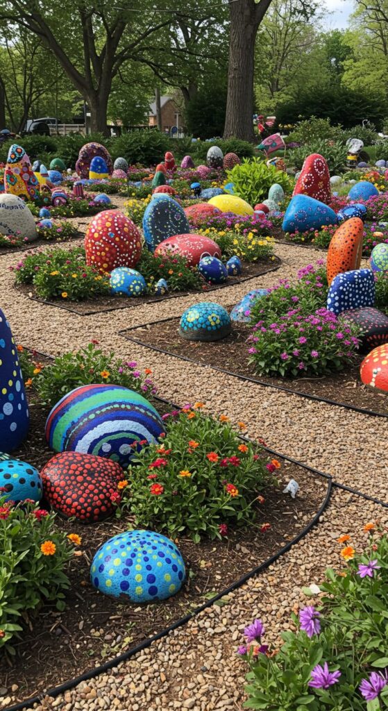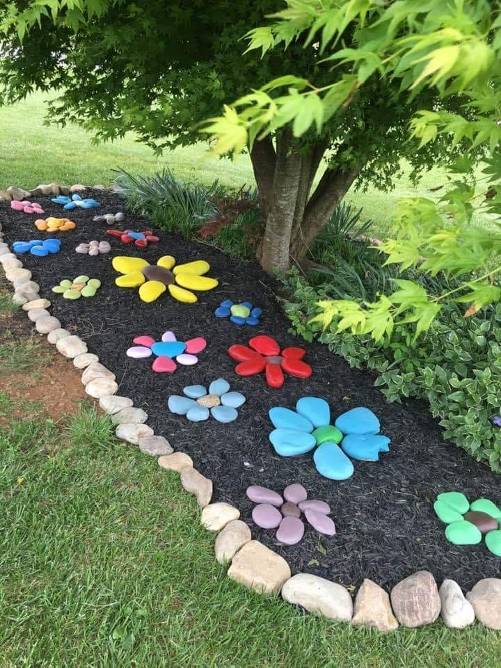 After you are done painting the rocks, arrange them in your garden to make them look like flowers.