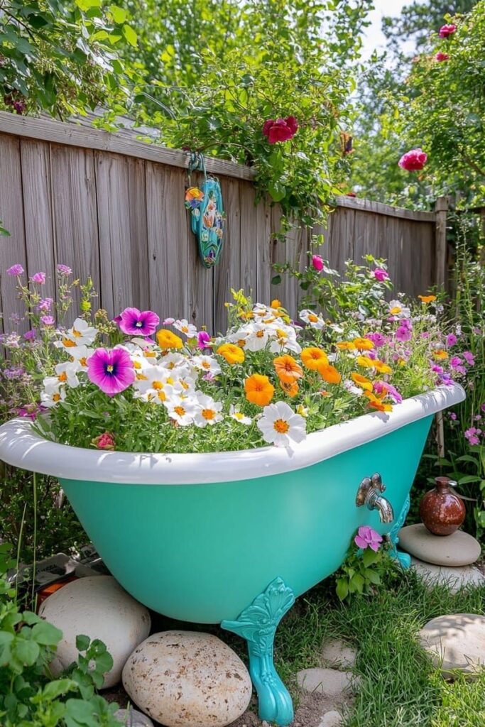 Are you planning on throwing out your old bathtub? If so, instead of throwing it out, repurpose it and turn it into an eye-catching flower planter.