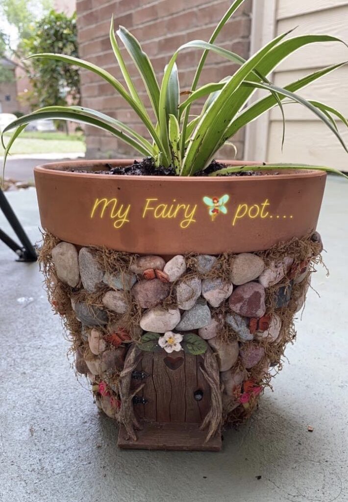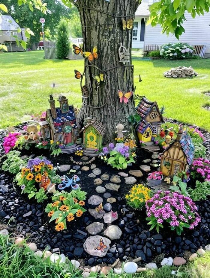 Here is another stunning DIY fairy garden idea that’ll guarantee compliments. Incorporate miniature houses, butterfly decals, flowers, and fairy lights for a magical feel.