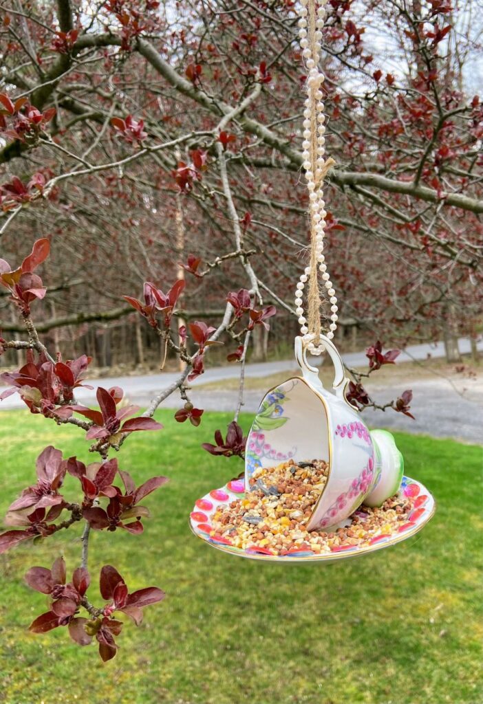 Glue the tea cup onto the plate and get a pearl lanyard to secure it on the tree branch. Then add some bird food around the plate and some inside as well.