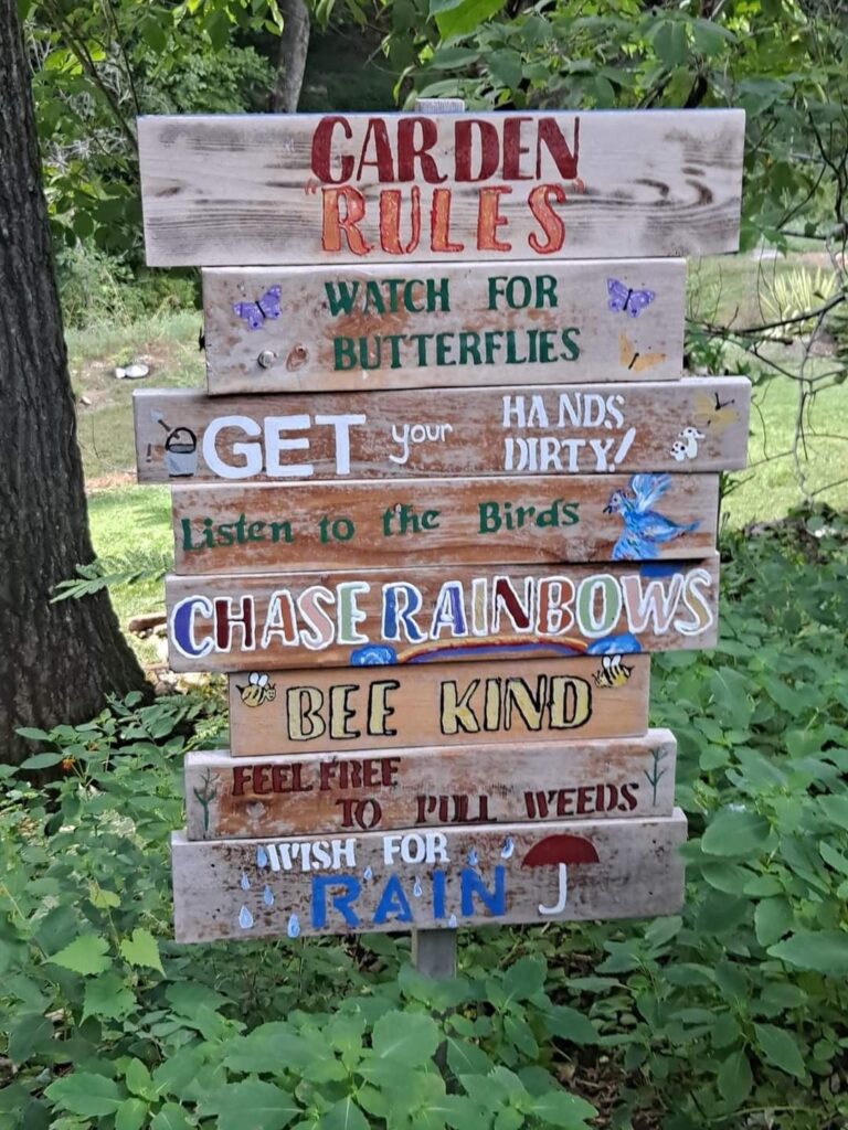 Every garden needs some garden rules. To recreate this idea, you will need lots of wooden boards, nails, a hammer, and, of course, paint.