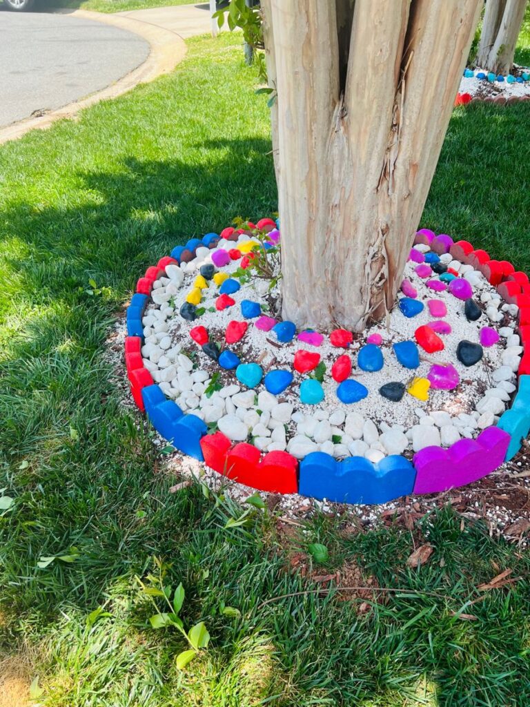 I suggest going with pink, purple, red, and blue. Place them around the trunk of a tree for the perfect garden decoration.