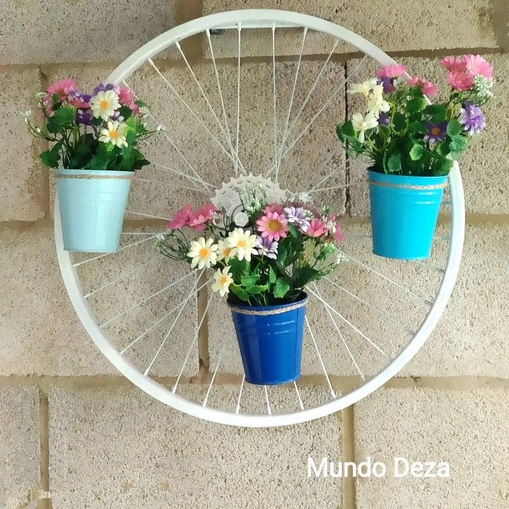 This is another great DIY garden art idea. You can place this up against a tree or on a wooden palette. Hot glue some colorful planters on the wheel and add some flowers to brighten things up.