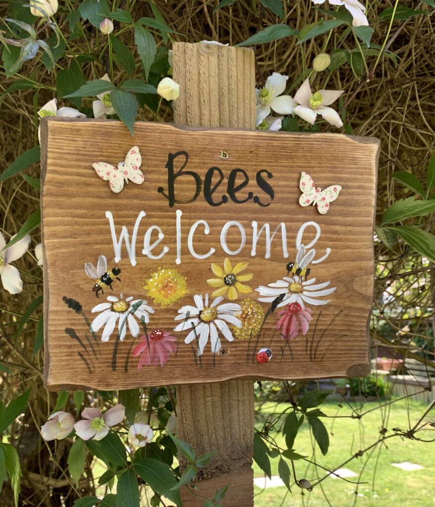 DIY this “bees welcome” sign for your flower garden. All you need are a couple of pieces of wood and, of course, some paint to make it all pretty.