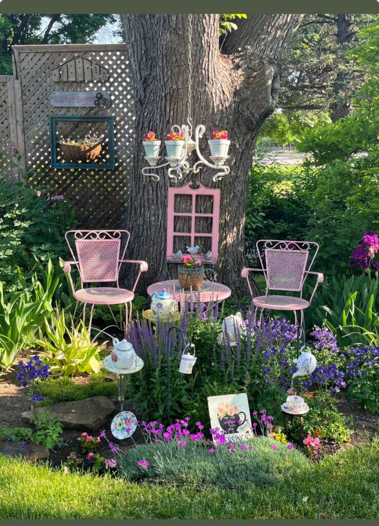 Create a small seating area in your garden with an accent table and a small chair. You can place this near a tree. You can also go an extra step further and hang a chandelier from the branch.