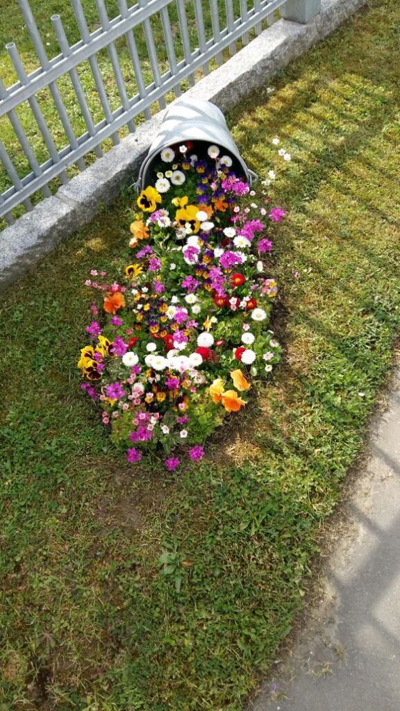 If you want something that looks effortless, this is for you. This flower garden idea just looks like the bucket fell over, and no one has picked it up.