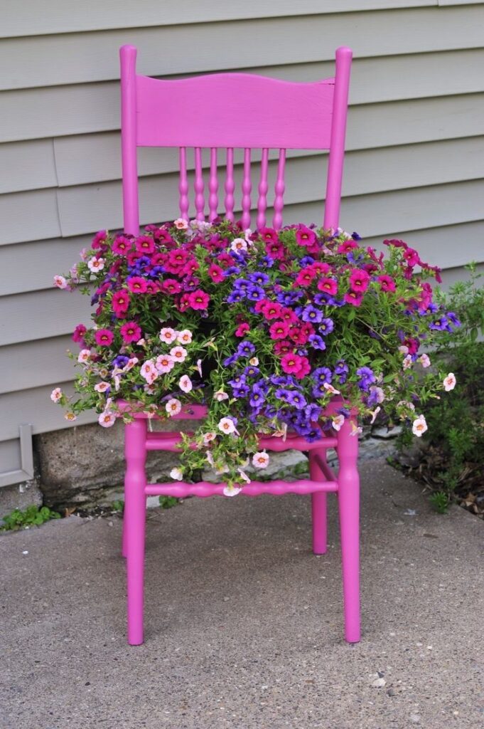 I love how creative this is! Repurpose your old chair and turn it into a stunning planter. First, you’ll want to paint it a vibrant color like pink, purple, or yellow.