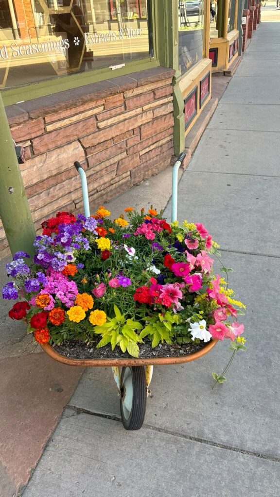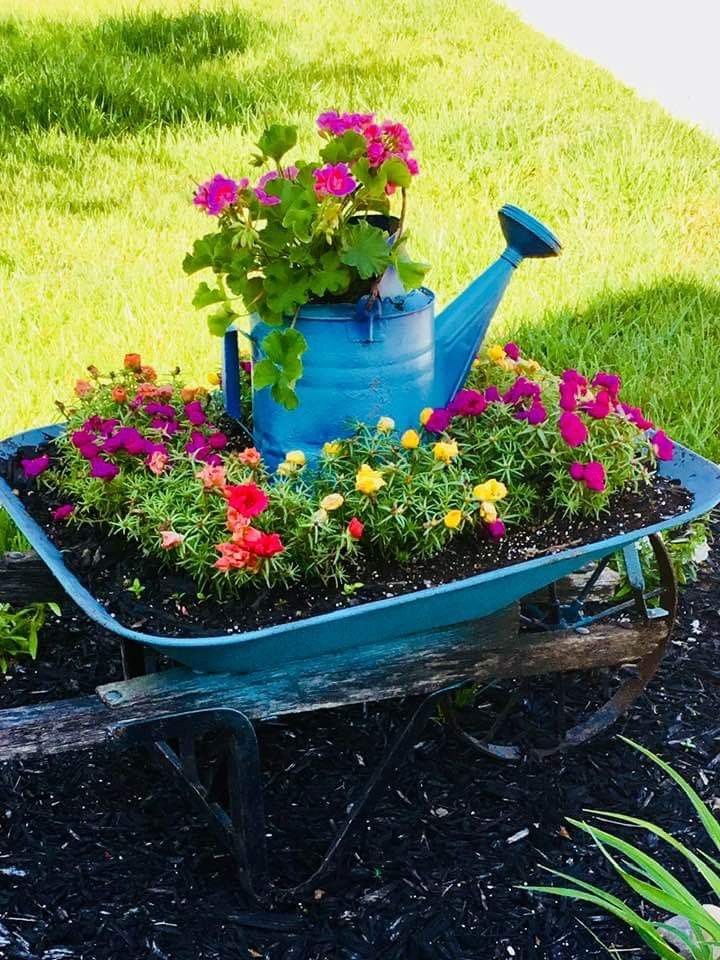 Take your wheelbarrow planter to the next level and incorporate a bunch of different flowers. Include violets, roses, sunflowers, lilies, and others.