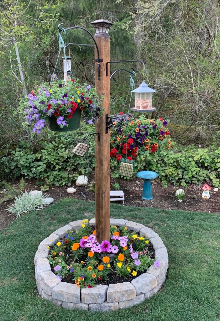 Create a very pretty bird feeder garden by planting lots of colorful flowers and hanging a bird feeder on the hook above. This idea is absolutely perfect for your backyard.