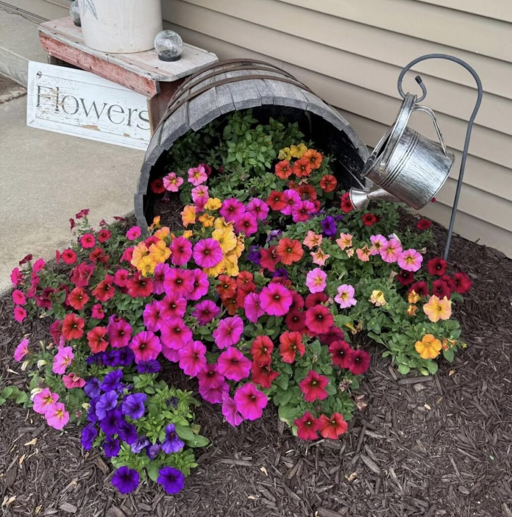 This is similar to the overflowing flower bucket from above, just with a wine barrel instead. Plant colorful and vibrant flowers like zinnias, daisies, sunflowers, and lilies.
