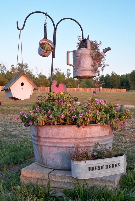 Plant your choice of flowers, and on the hooks, hang up a watering can with holes on the bottom. This way, your garden will get lots of water throughout the day without you having to physically do it.