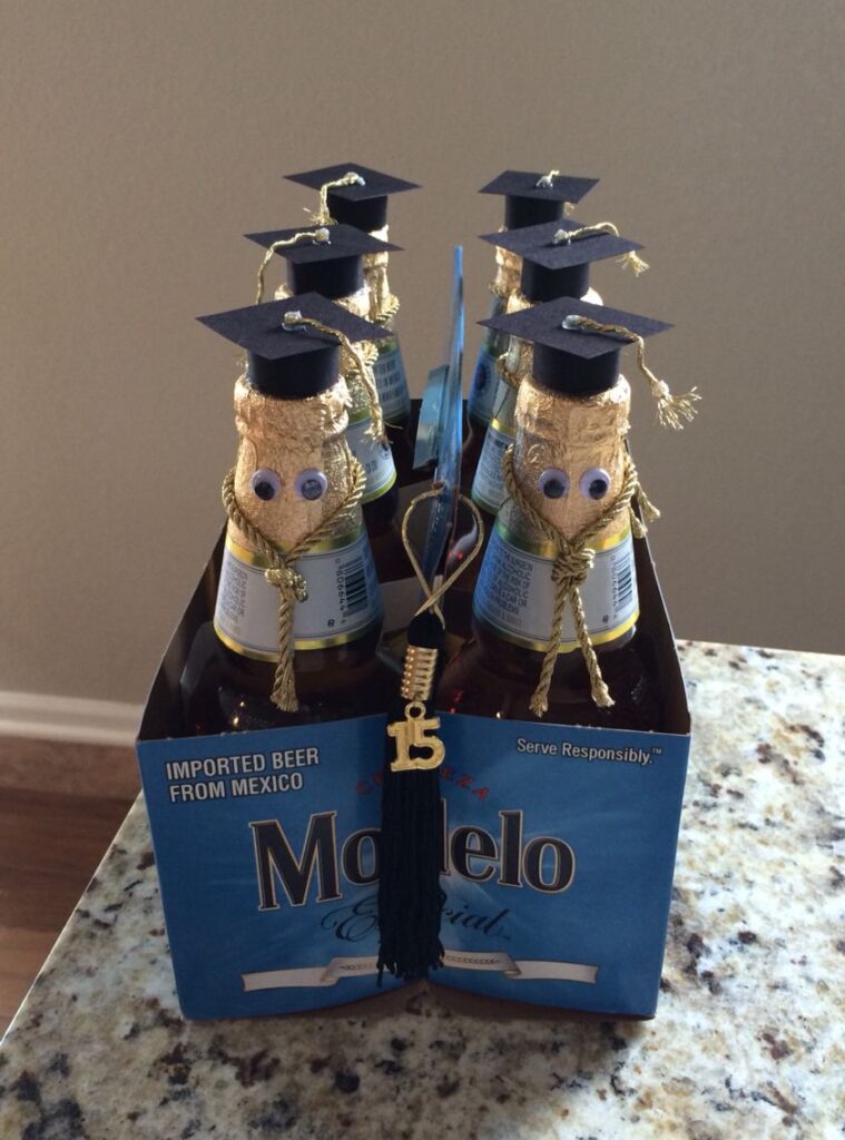 How cute is this beer basket? If your grad loves beer, then get them a pack and dress them up to look like cute little graduates, too. You can use construction paper to make the cap and add a couple of googly eyes to complete the look.