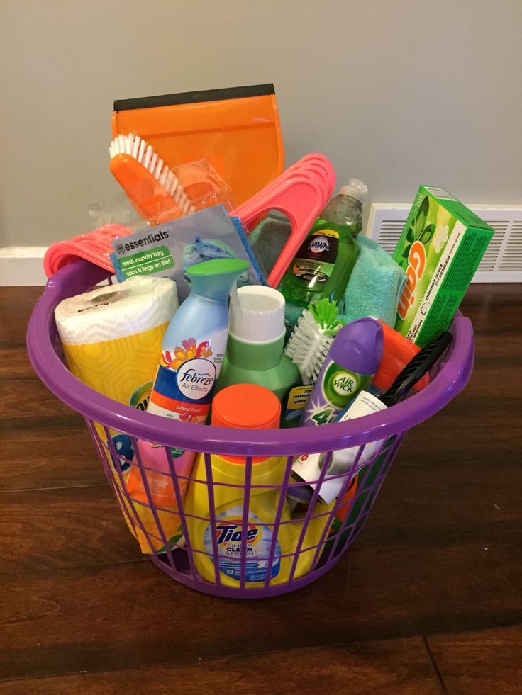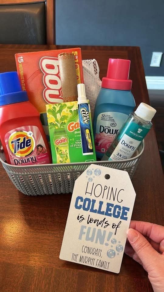 This is a gift basket that the grad will use every day. Include cleaning products like laundry detergent, Febreeze, dish soap, paper towels, mop, a broom, and other products that the grad will need to make their dorm clean and smelling fresh.