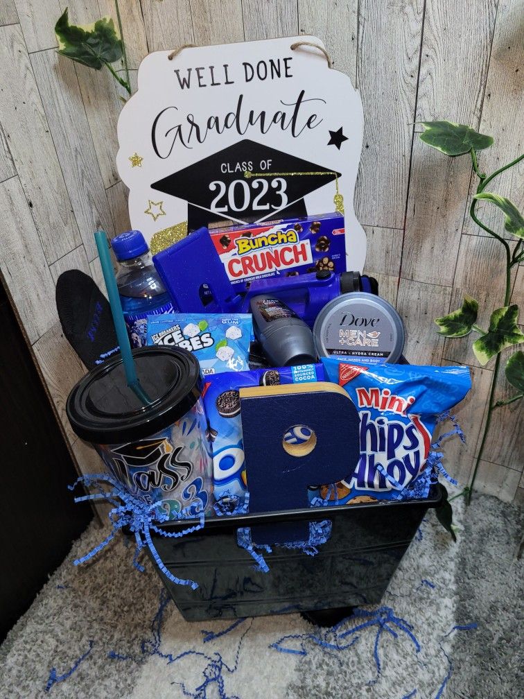 If your graduate’s favorite color is blue, they are going to love this blue-themed basket. Buy snacks and items that are all blue. For example, you can include Oreo, a water bottle, self-care, Pepsi, and Chips Ahoy.