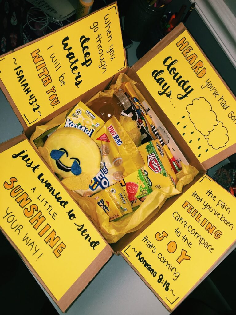 This is a great gift basket idea for graduates. Especially if they are heading off to college soon. Make the interior of the box a bright yellow and include only yellow-themed snacks and goodies.