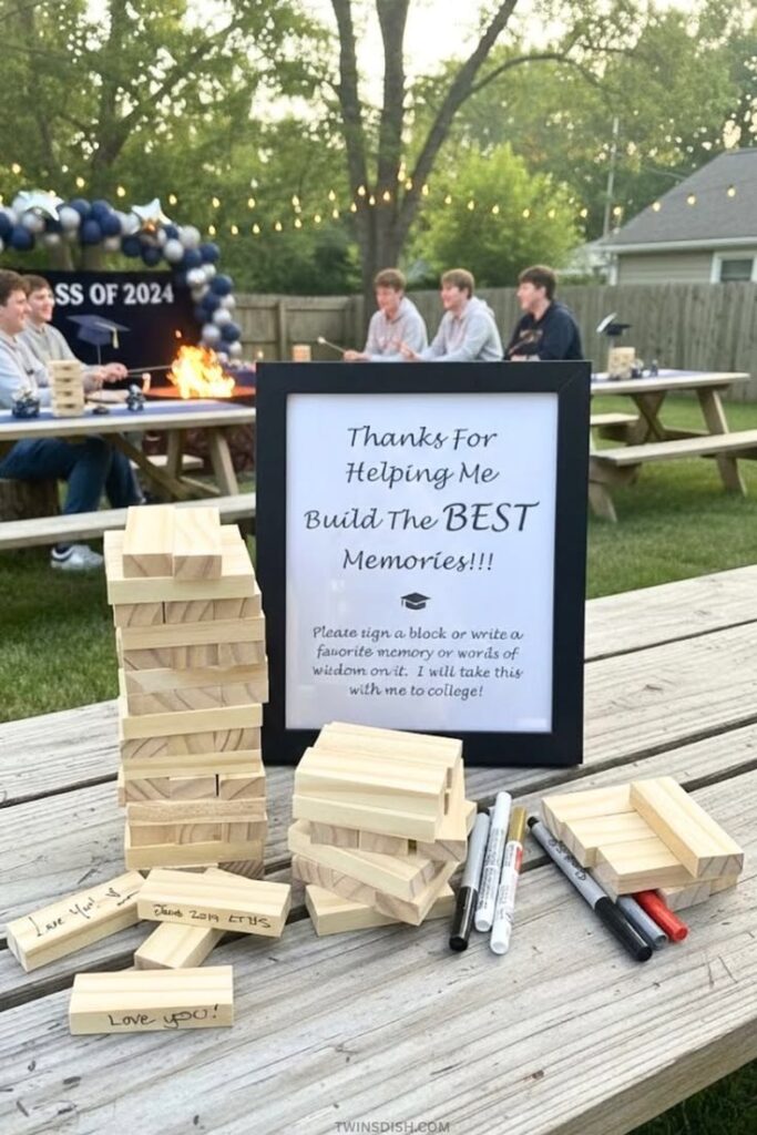 You’ll want to get some wooden blocks along with a few Sharpie markers. Have the guests sign a block or write down their favorite memory with you.
