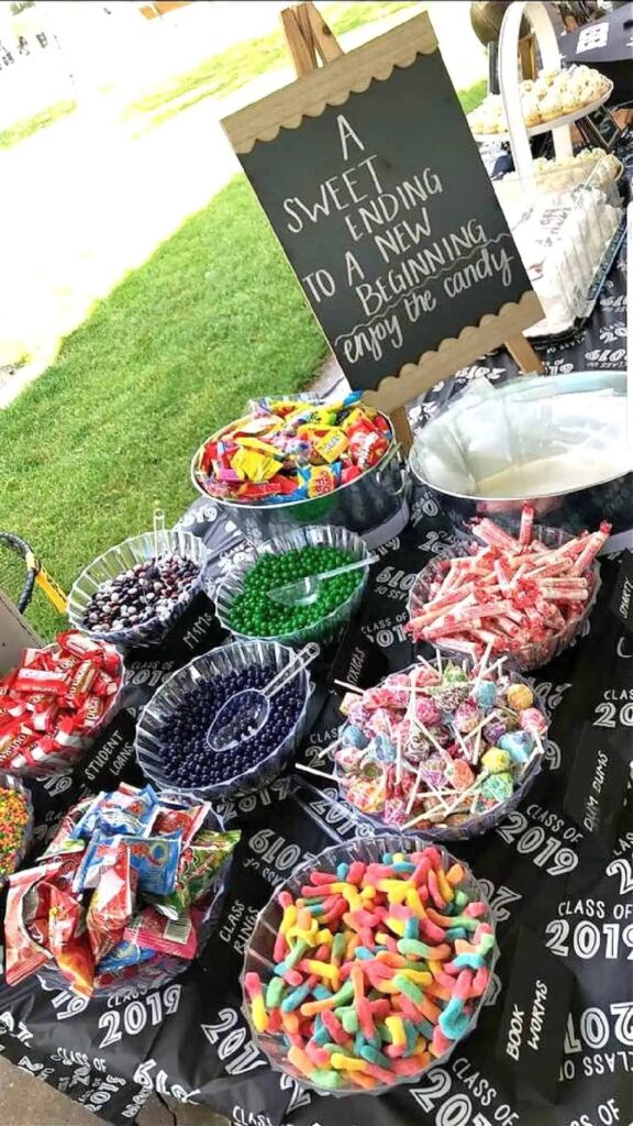 Every grad party needs a candy buffet. It’s a sweet way to end the party, and guests can munch on it throughout it as well.