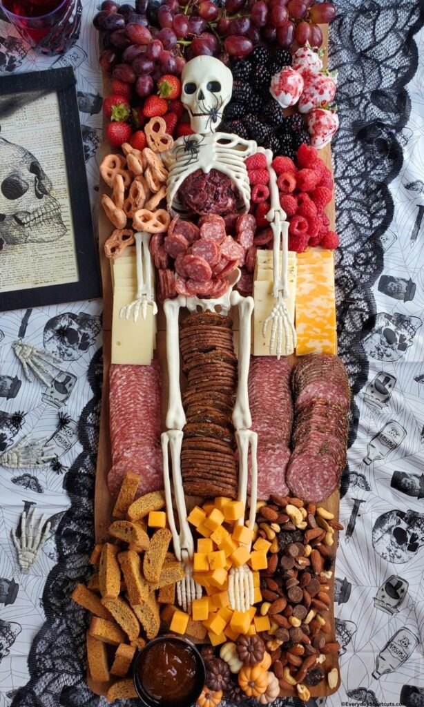 This is absolutely stunning! I know most charcuterie boards aren’t this large, but it’s Halloween and we’re going all out! Buy a large cutting board from Amazon along with the skeleton.