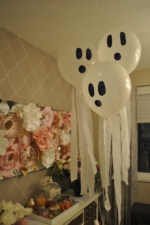 Want more decorations to amp up your party? Grab some white balloons, crepe paper, and a black Sharpie. Draw 3 black circles after blowing them up to make them look like ghosties.