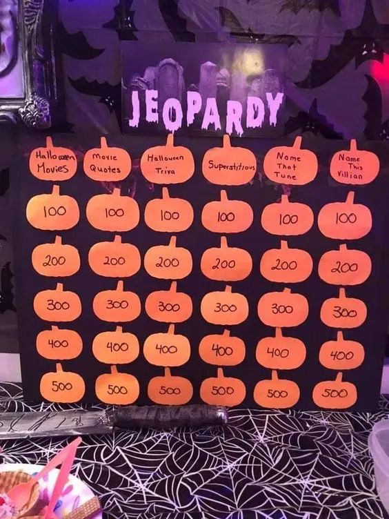 Put a twist on the classic game of jeopardy and recreate this idea. Make pumpkin shapes and write down the number of points and the categories on them.