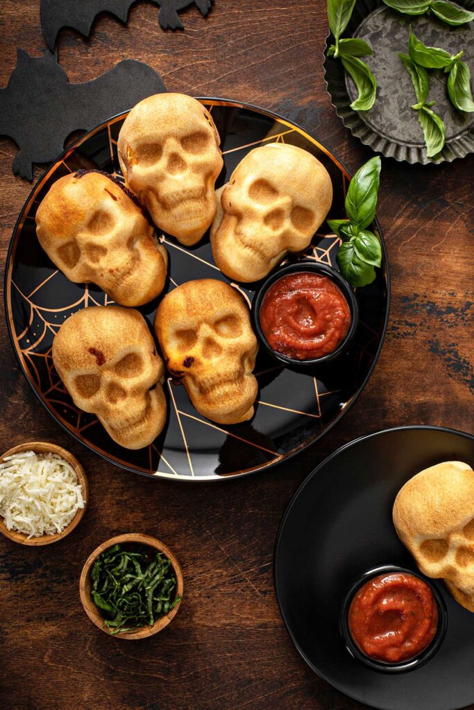 If you are searching for a fun snack or appetizer to serve at your Halloween party, these pizza skulls are exactly what you’re looking for. They are perfectly on theme and taste incredible.