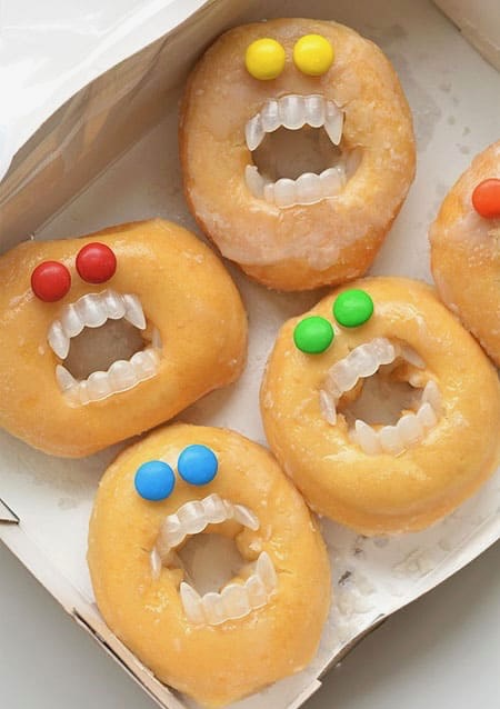 Who can say no to donuts? They are the perfect sweet treats to end the night with. Decorate them with colorful M&M’s and fake vampire teeth to make them look a little more Halloween-y.