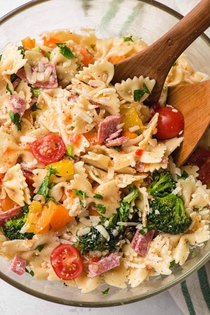 How colorful and delicious does this look? It’s made with rotini pasta, smoked salami, fresh veggies and herbs, two types of cheese, and a tangy homemade Italian dressing.