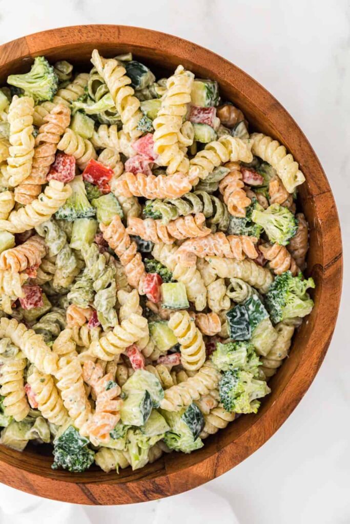 My sister LOVES ranch so I know for a fact she’s going to love this recipe. It’s made with tri-colored rotini pasta, bell peppers, broccoli, cucumber, and a homemade creamy ranch dressing.