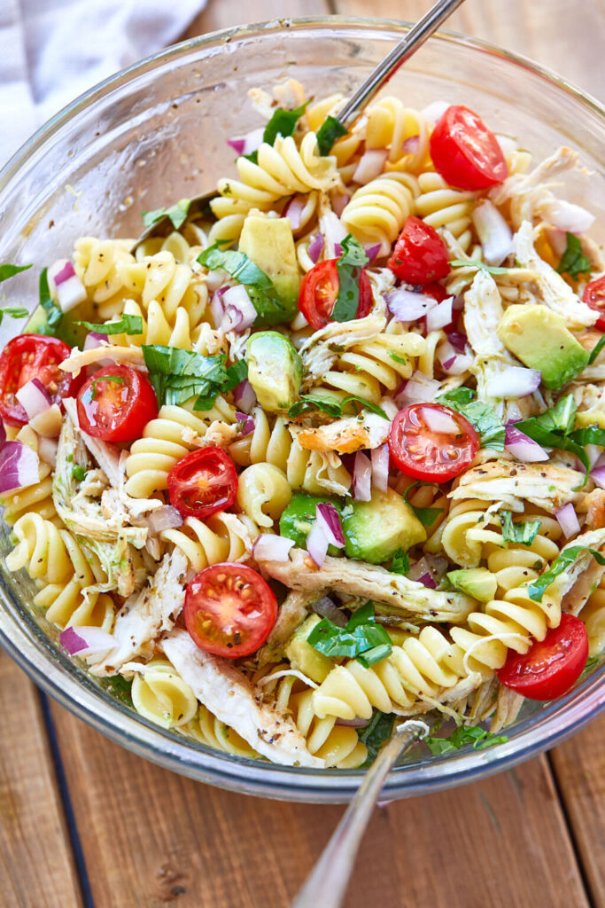 Love pasta but want a healthier option? Try out this mouthwatering healthy chicken pasta salad recipe with avocado, tomato, and basil.