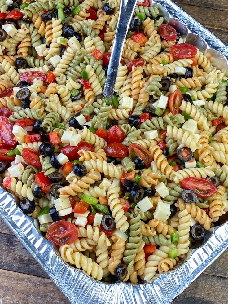 This easy pasta salad recipe can be made in less than 25 minutes! It has tri-colored rotini pasta, diced olives, pimento, and a delicious and zesty homemade Italian dressing.