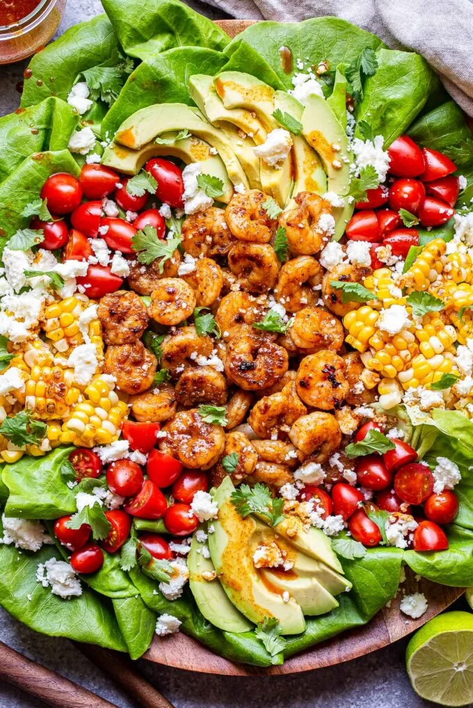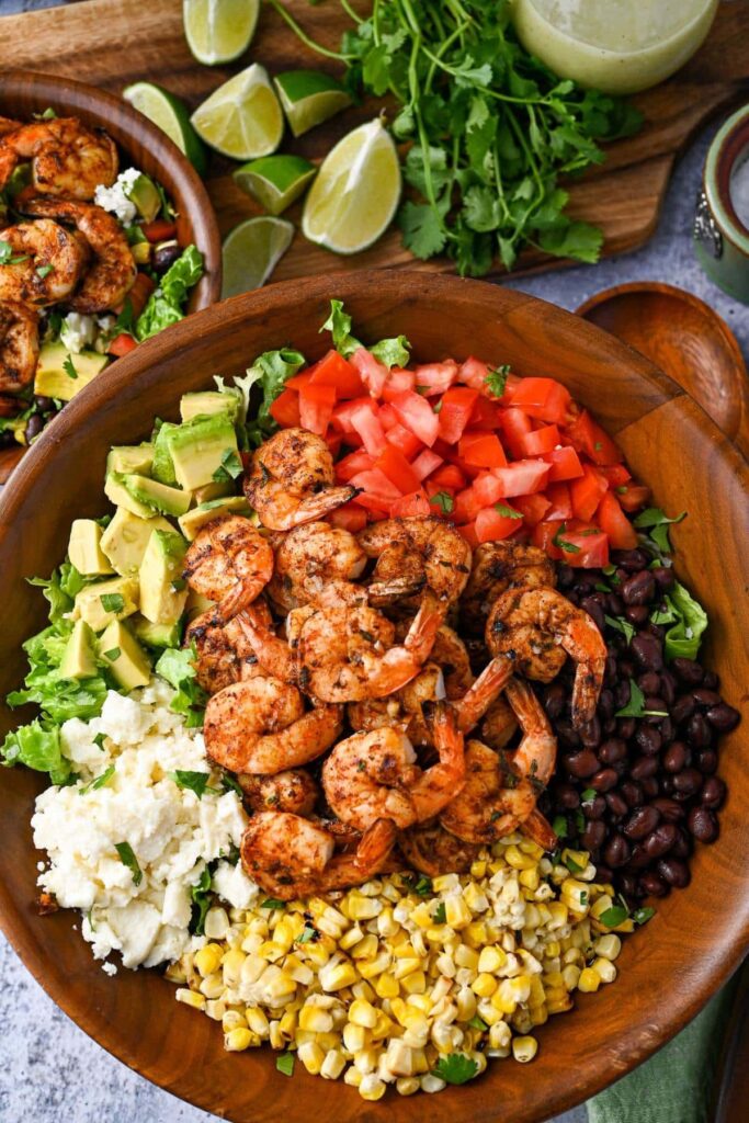 This Mexican-inspired salad is going to be a huge hit at family dinner. It is made with marinated grilled shrimp, grilled corn, black beans, avocado, tomatoes, salad greens, and crumbled queso fresco.