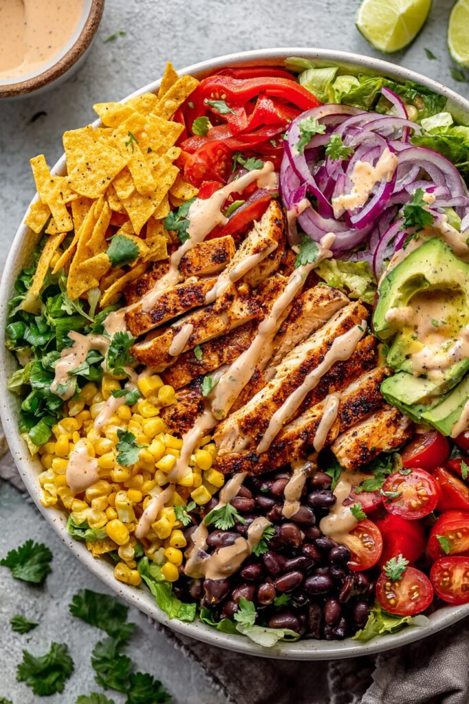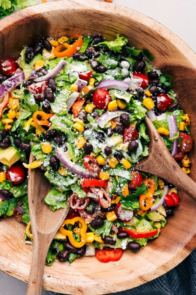 Yes, this salad does indeed taste as good as it looks. It is made with romaine lettuce, corn, black beans, grilled chicken, and taco-flavored ranch dressing that you will love.