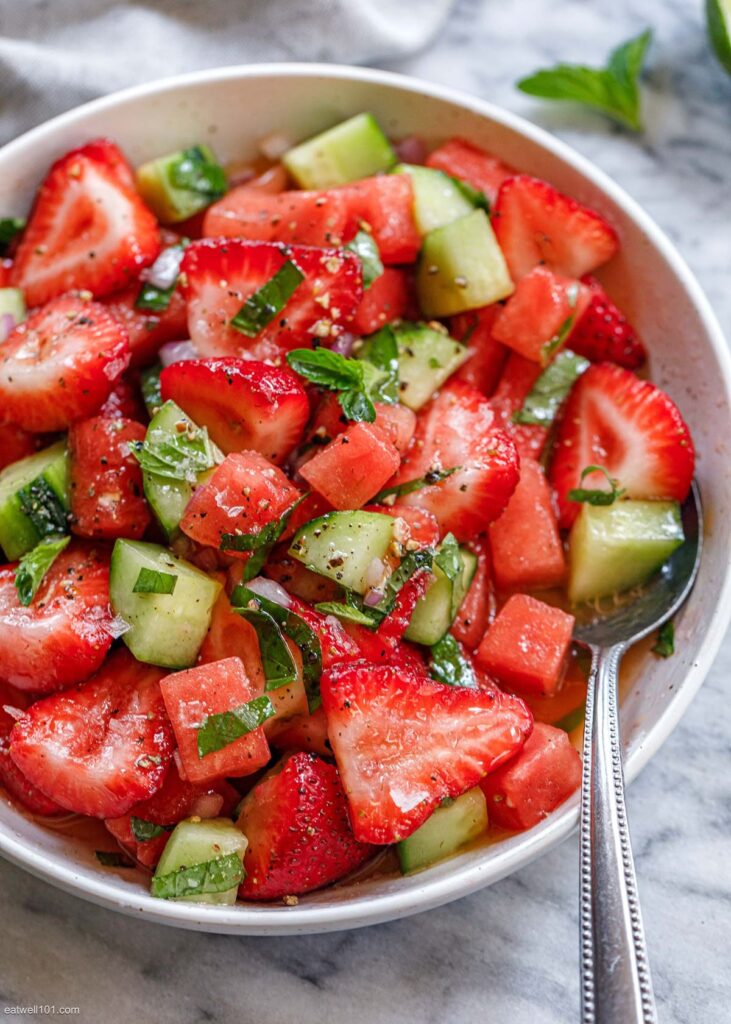 Enjoy this light and fresh cucumber and strawberry salad all summer long with just a few simple ingredients.
