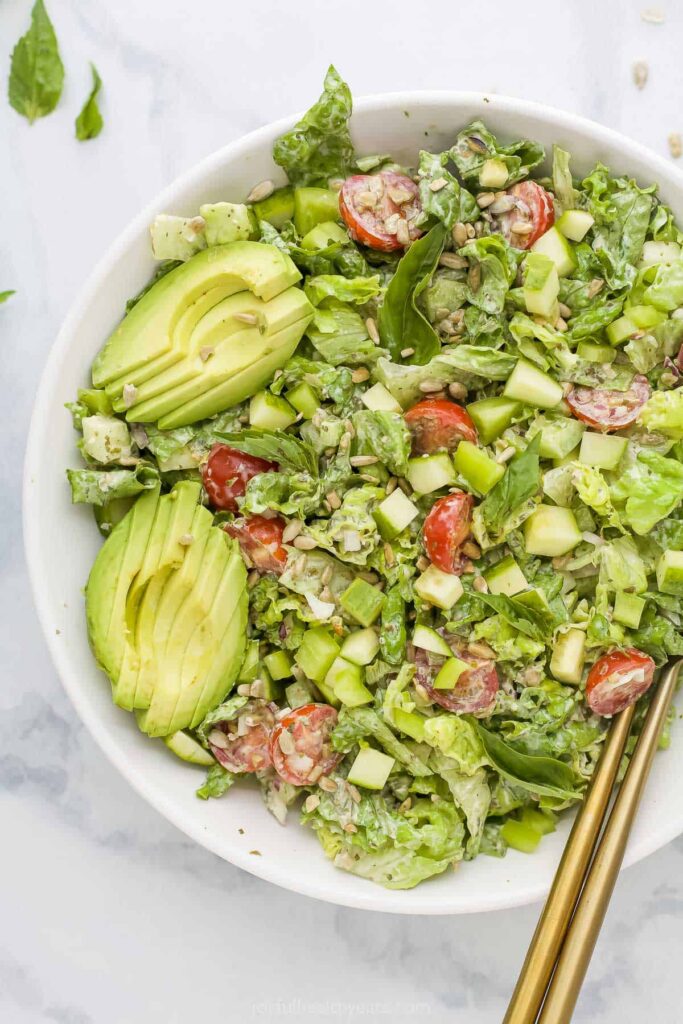 This green goddess salad is an insanely popular salad. It is made with tomatoes, cucumbers, avocado, sunflower seeds, and is tossed in a tasty homemade green goddess dressing that you won’t get enough of.