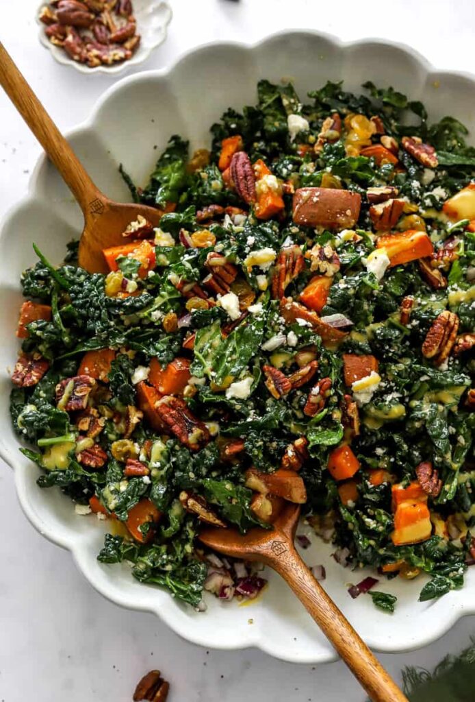 Is it just me, or is this salad not totally giving off major fall vibes? It is made with kale, roasted sweet potatoes, quinoa, goat cheese, pecans, and some other ingredients.