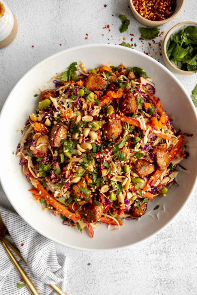 This may just be my favorite salad recipe on this list. How insanely good does that look? It is made with noodles, veggies, fresh herbs, and a tasty peanut sauce.