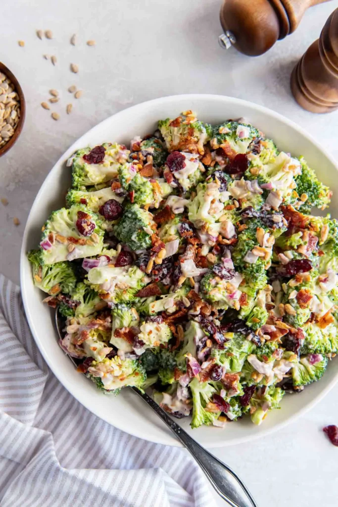 Give broccoli another chance and recreate this salad recipe. It is made with broccoli, of course, along with cranberries, bacon, and sunflower seeds.