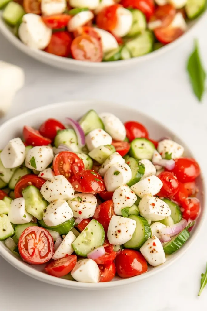 This cucumber and caprese salad is perfect for the summertime. It is light, fresh, and great if you don’t want to spend a lot of time in the kitchen.