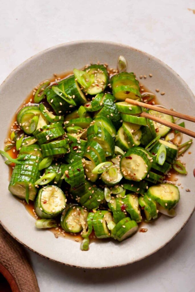 If you want something that doesn’t take more than 5 minutes to make, this spicy cucumber salad is for you. It is insanely easy to make, flavorful, and has the perfect amount of spice.