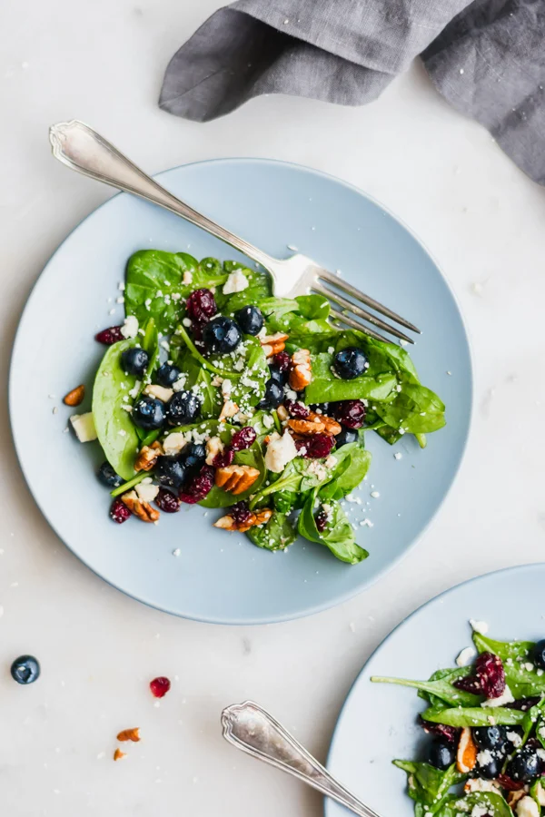 This blueberry spinach salad is sure to go on your weekly dinner rotation. It is made with a spinach base, blueberries, and pecans for an added bit of crunch.