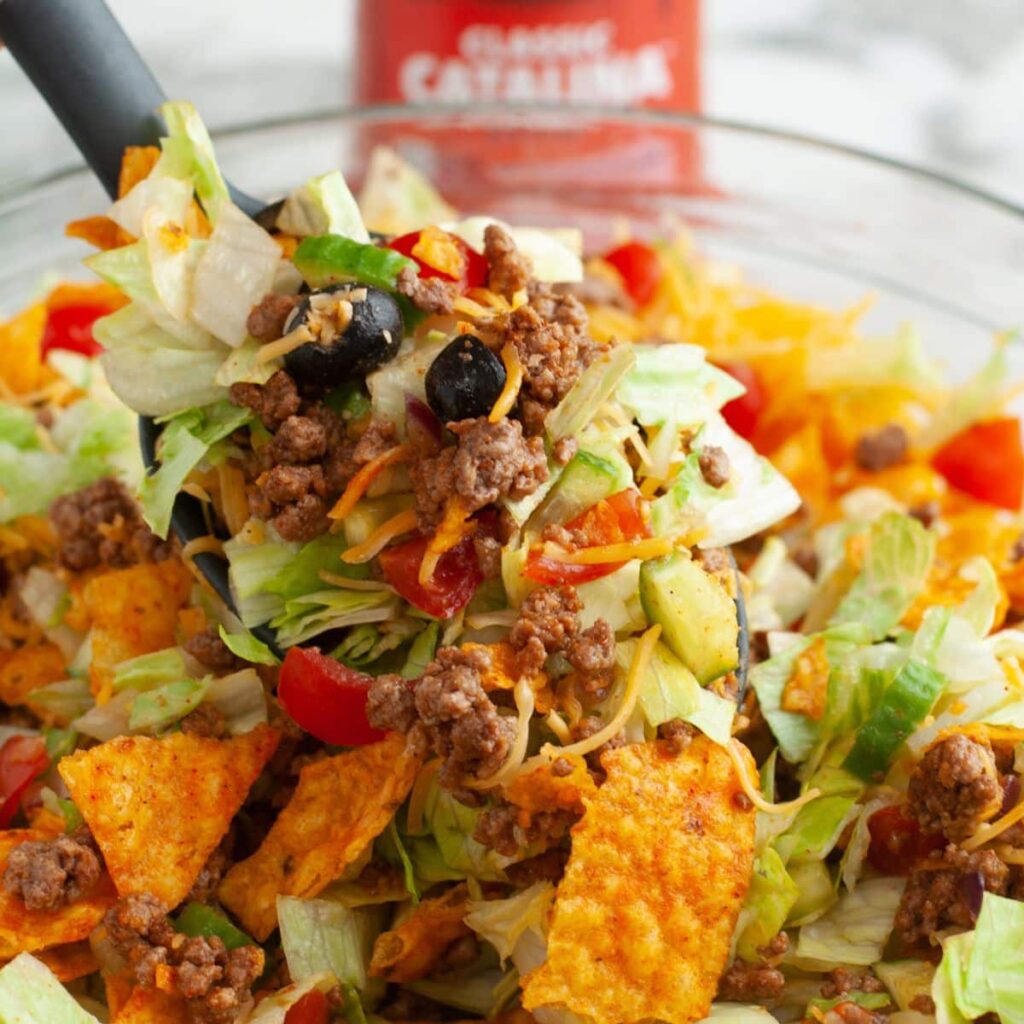 Enjoy all the flavors of a taco with this tasty taco salad with Catalina dressing. It has flavorful meat, fresh veggies, and crunchy chips to top it off.