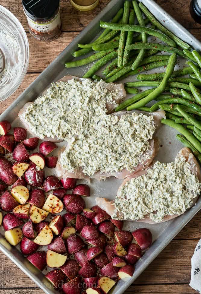 Make a filling and delicious dinner for busy weeknights with this sheet pan spinach herb baked chicken recipe.